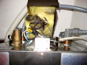 The smoke and odor cleared and I went back in to see what the heck happened. It was obvious that whoever installed this new water heater didn’t know what they were doing and could of caused a large fire and / or killed someone. Knowing that I was safe, I leaned over, kneeling on the settee with one hand on the settee and the other on the water heater case. I opened the metal cover over the wire connections and was faced with several the problems.